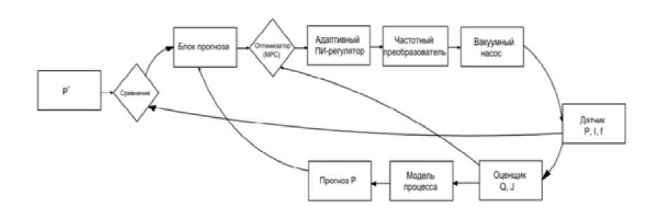 Система образует замкнутый контур, в котором задание Р * последовательно проходит через блок прогнозирования, MPC-оптимизатор, адаптивный ПИ-регулятор и частотный преобразователь, воздействуя на исполнительный механизм – асинхронный двигатель вакуумного насоса. Обратная связь по давлению Р, току 1 и частоте f, обогащённая данными от блока оценки состояния и модели процесса, обеспечивает адаптивное и опережающее управление.