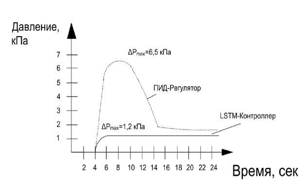 LSTM-контроллер (Сплошная линия): благодаря прогностическому модулю, контроллер упреждает развитие возмущения. Максимальное отклонение вакуума снижается до ^Ртах ~ 1,2 кПа, что гарантирует высокую стабильность [4].