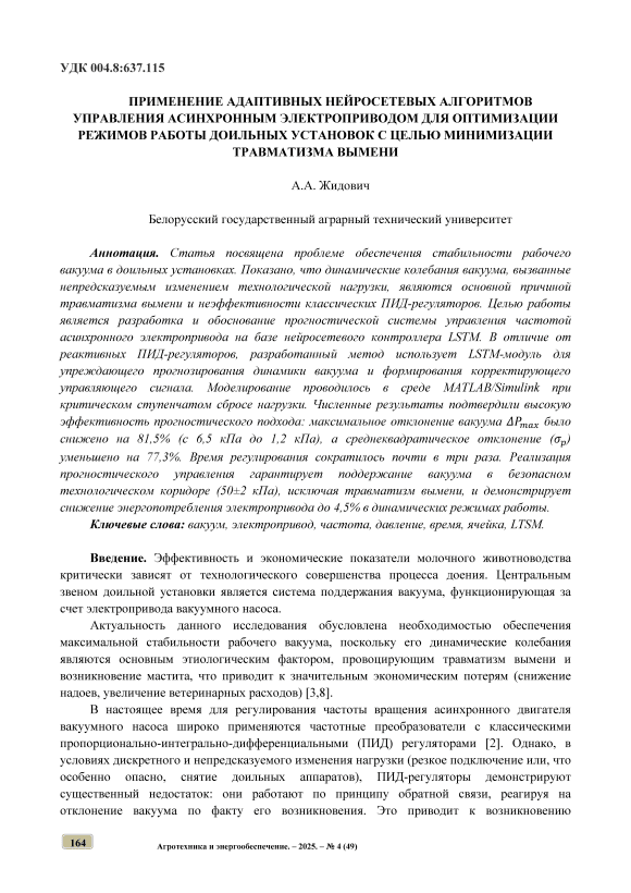 Статья посвящена проблеме обеспечения стабильности рабочего вакуума в доильных установках. Показано, что динамические колебания вакуума, вызванные непредсказуемым изменением технологической нагрузки, являются основной причиной травматизма вымени и неэффективности классических ПИД-регуляторов. Целью работы является разработка и обоснование прогностической системы управления частотой асинхронного электропривода на базе нейросетевого контроллера LSTM. В отличие от реактивных ПИД-регуляторов, разработанный метод использует LSTM-модуль для упреждающего прогнозирования динамики вакуума и формирования корректирующего управляющего сигнала. Моделирование проводилось в среде MATLAB/Simulink при критическом ступенчатом сбросе нагрузки. Численные результаты подтвердили высокую эффективность прогностического подхода: максимальное отклонение вакуума 𝛥𝑃𝑚𝑎𝑥 было снижено на 81,5% (с 6,5 кПа до 1,2 кПа), а среднеквадратическое отклонение (𝜎𝑝) уменьшено на 77,3%. Время регулирования сократилось почти в три раза. Реализация прогностического управления гарантирует поддержание вакуума в безопасном технологическом коридоре (50±2 кПа), исключая травматизм вымени, и демонстрирует снижение энергопотребления электропривода до 4,5% в динамических режимах работы.