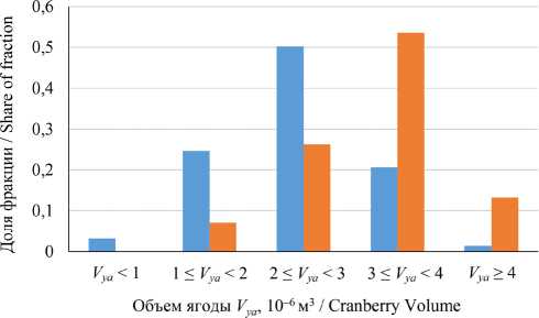 В связи с расхождением фракционного состава ягод клюквы крупноплодной, полученного на основании вычисленного и измеренного объема ягод, провели сопоставление результатов измерений с имеющимися в литературных источниках данными [6] и установили, что распределение ягод клюквы крупноплодной по фракциям на основании вычисленного объема лучше согласуется с имеющейся априорной информацией. Таким образом, можно предположить, что вычисление объема ягоды по трем линейным измерениям обеспечивает меньшую погрешность по сравнению с прямым определением ее объема методом вытеснения жидкости.