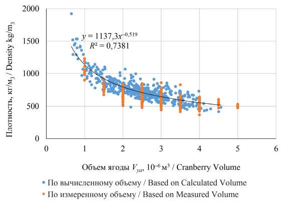 Распределение плотности ягод клюквы крупноплодной, рассчитанной по вычисленному и измеренному объемам, показано на рисунке 3. При построении графика по оси абсцисс откладывали объем каждой ягоды, а по оси ординат – плотность, в результате чего получили облако точек, представляющее собой распределение плотности ягод в зависимости от их объема.