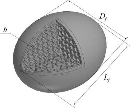3D-модель макета ягоды клюквы (рис. 4) представляет собой эллипсоид с осями L f , D f . Конструктивно модель имеет сплошную оболочку толщиной b , пространство внутри которой заполнено сотовой структурой.