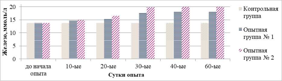 Рис.1 – Изменение содержания уровня сывороточного железа у голштинских коров при применении болюсов на основе прополиса и родиолы розовой