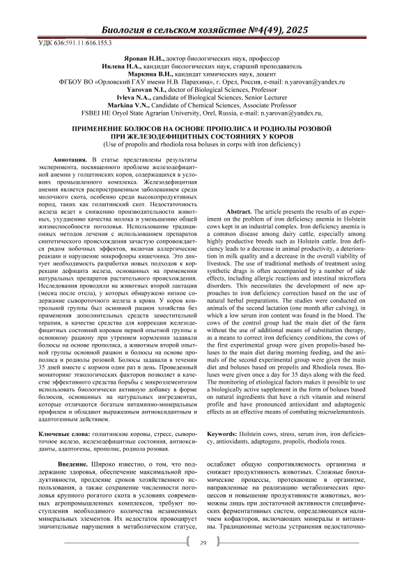В статье представлены результаты эксперимента, посвященного проблеме железодефицитной анемии у голштинских коров, содержащихся в условиях промышленного комплекса. Железодефицитная анемия является распространенным заболеванием среди молочного скота, особенно среди высокопродуктивных пород, таких как голштинский скот. Недостаточность железа ведет к снижению производительности животных, ухудшению качества молока и уменьшению общей жизнеспособности поголовья. Использование традиционных методов лечения с использованием препаратов синтетического происхождения зачастую сопровождается рядом побочных эффектов, включая аллергические реакции и нарушение микрофлоры кишечника. Это диктует необходимость разработки новых подходов к коррекции дефицита железа, основанных на применении натуральных препаратов растительного происхождения. Исследования проводили на животных второй лактации (месяц после отела), у которых обнаружено низкое содержание сывороточного железа в крови. У коров контрольной группы был основной рацион хозяйства без применения дополнительных средств заместительной терапии, в качестве средства для коррекции железодефицитных состояний коровам первой опытной группы к основному рациону при утреннем кормлении задавали болюсы на основе прополиса, а животным второй опытной группы основной рацион и болюсы на основе прополиса и родиолы розовой. Болюсы задавали в течении 35 дней вместе с кормом один раз в день. Проведенный мониторинг этиологических факторов позволяет в качестве эффективного средства борьбы с микроэлементозом использовать биологически активную добавку в форме болюсов, основанных на натуральных ингредиентах, которые отличаются богатым витаминно-минеральным профилем и обладают выраженным антиоксидантным и адаптогенным действием.