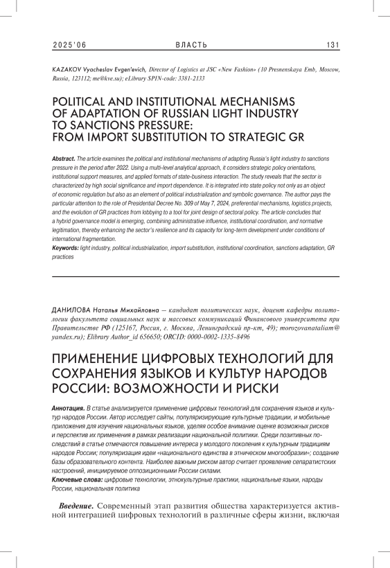 The article analyzes the use of digital technologies for preserving the languages and cultures of the ethic groups of Russia. Websites that popularize cultural traditions and mobile applications for learning ethnic languages are explored. The article pays a particular attention to assessing possible risks and prospects for their application within the framework of national policy implementation. Among the positive consequences are the increased interest among the younger generations in the cultural traditions of Russia’s ethnic groups; popularization of the idea of national unity in ethnic diversity; creation of an educational content database. The author considers the manifestation of separatist trends initiated by forces opposing Russia to be the most significant risk.