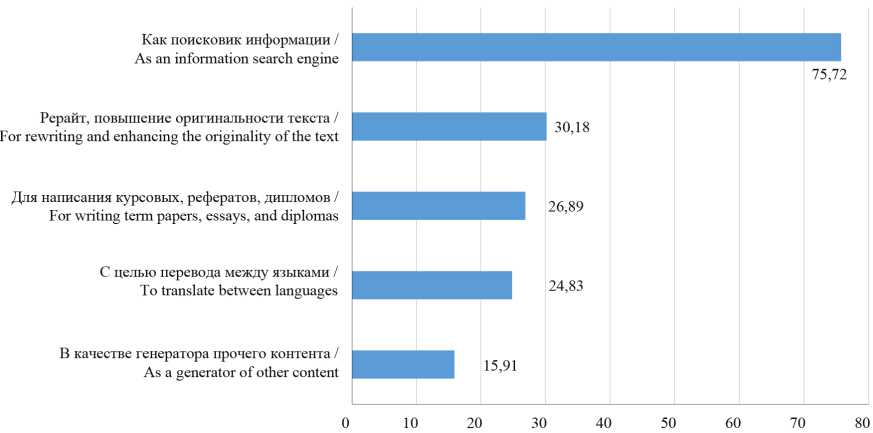 В исследовании также определялась цель использования респондентами ИИ в образовательном процессе (рис. 1). Участникам, использующим нейросети в обучении ( n = 630), были предложены варианты ответов с правом множественного выбора. В результате большинство студентов используют нейросети в качестве поисковика (75,72 %).