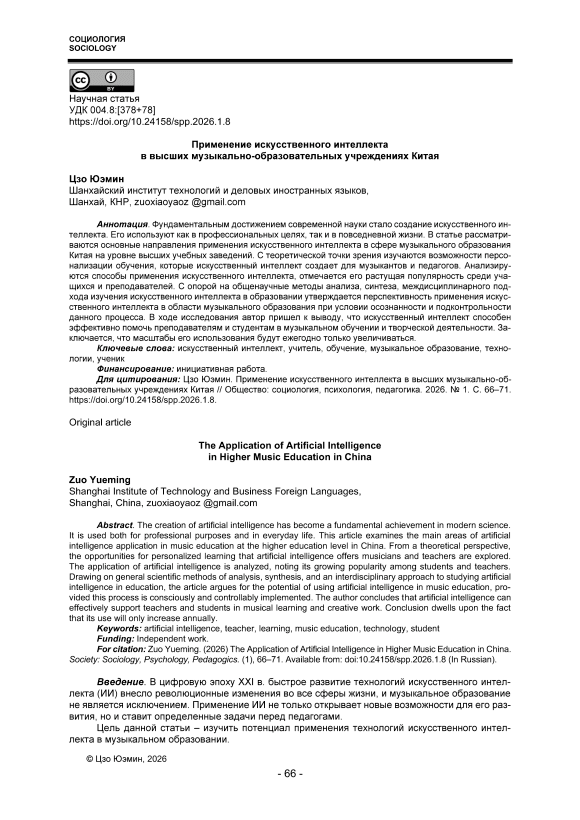Фундаментальным достижением современной науки стало создание искусственного интеллекта. Его используют как в профессиональных целях, так и в повседневной жизни. В статье рассматриваются основные направления применения искусственного интеллекта в сфере музыкального образования Китая на уровне высших учебных заведений. С теоретической точки зрения изучаются возможности персонализации обучения, которые искусственный интеллект создает для музыкантов и педагогов. Анализируются способы применения искусственного интеллекта, отмечается его растущая популярность среди учащихся и преподавателей. С опорой на общенаучные методы анализа, синтеза, междисциплинарного подхода изучения искусственного интеллекта в образовании утверждается перспективность применения искусственного интеллекта в области музыкального образования при условии осознанности и подконтрольности данного процесса. В ходе исследования автор пришел к выводу, что искусственный интеллект способен эффективно помочь преподавателям и студентам в музыкальном обучении и творческой деятельности. Заключается, что масштабы его использования будут ежегодно только увеличиваться.