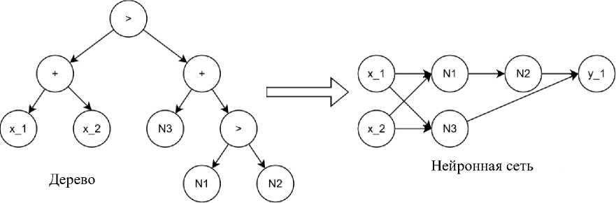 Рис. 1. Пример преобразования дерева в нейронную сеть
