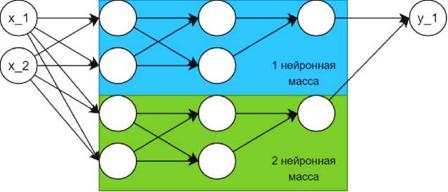 При автоматизированном проектировании нейронной сети с помощью SCGP могут создаваться нейронные массы (рис. 3) – скопления нейронов, которые не имеют связей друг с другом для обмена информации (исключением являются входной и выходной слоем).