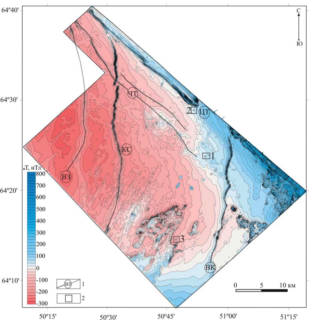 Fig. 1. Map of the anomalous magnetic field of the Chetlas uplift on the scale of 1:25000 (Zlokazov, Lavrova et al., 20011). 1 — faults: ВЗ — Vizinga, КС — Kosyu, ВК — Vorykva, ЧТ — Chetlass, ЦТ — Central Timan; 2 — objects of study: 1 — Verkhnemezenskaya explosion pipe, 2 — «Pavyuga» magnetic anomaly, 3 — «Kamenskaya» magnetic anomaly