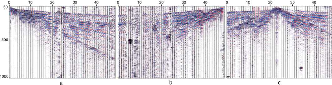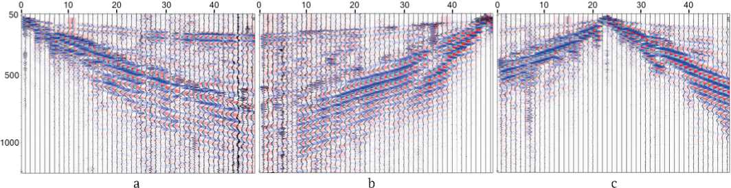 Рис. 11. Примеры сейсмограмм, полученных на участке магнитной аномалии «Каменская». ПВ 1 (a), ПВ 47 (b), ПВ 23 (c)