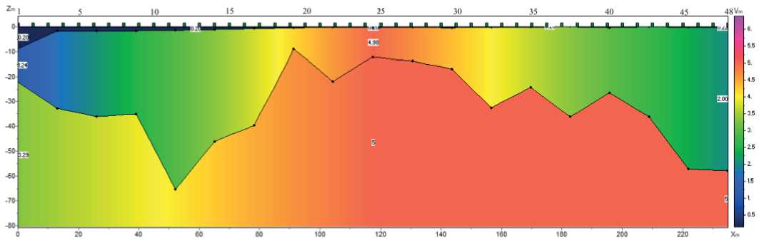 Рис. 10. Скоростной разрез участка магнитной аномалии «Павьюга», построенный по продольным волнам