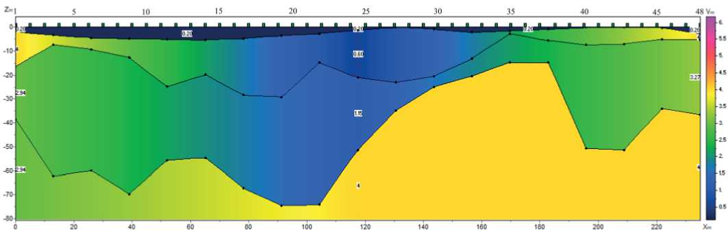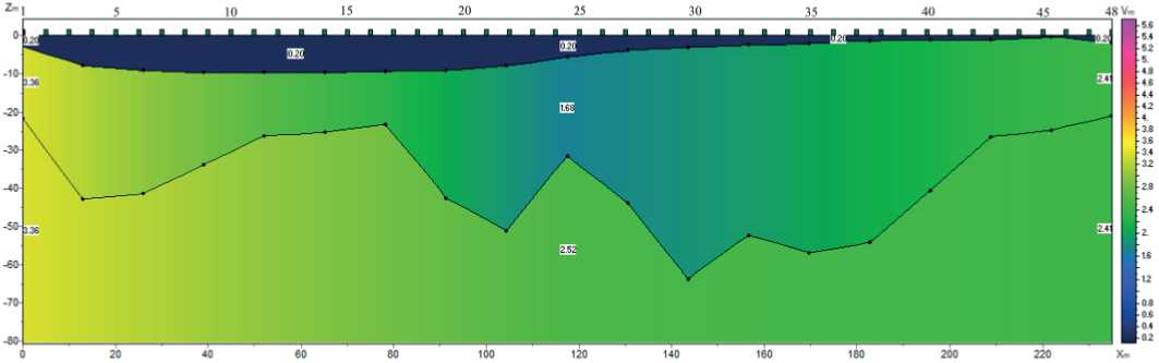 Прямая продольная волна регистрируется в ближней зоне до 25 м со скоростью 0.5–0.6 км/с. Преломленные волны приходят со скоростями 2–2.5 км/с. Поверхностные волны имеют скорости 0.4–0.45 км/с. Характер волновой картины спокойный, без аномальных зон и потери корреляции сейсмической записи, которая прослеживается до1000 мс. На скоростном разрезе область отмечается аномалией с пониженными значениями скоростей (рис. 12).