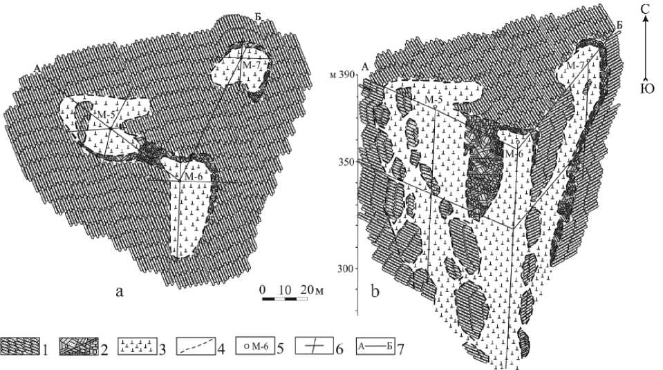 Рис. 2. Верхнемезенская кимберлитовая трубка: а — геологический план; b — блок-диаграмма с разрезом по линии А–Б (Айбабин и др., 19822). 1 — светлинская свита, кварциты, реже сланцы, прослои и линзы гравелитов (направления штриховки на планах и разрезах соответствуют основным направлениям простирания и падения пород); 2 — зоны дробления, брекчии кварцитов, сланцев; 3 — позднебайкальская ультраосновная формация, пикритовые порфириты; 4 — геологическая граница; 5 — скважина и ее номер; 6 — канавы; 7 — линия геологического разреза