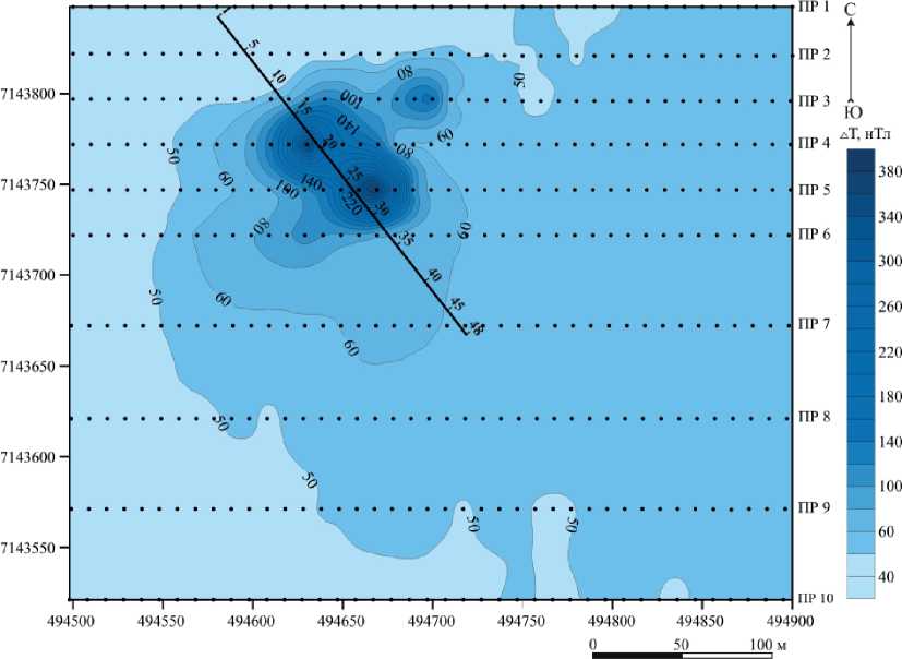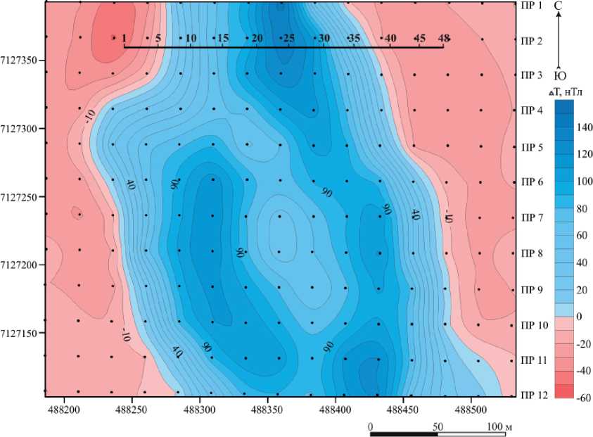 Павьюгская магнитная аномалия, выделенная и отработанная нами в 2016 г., в магнитном поле представляет собой положительную аномалию элипсовид-ной формы, простирающуюся в северо-северо-западном направлении, интенсивностью ∆Та 340 нТл. Размеры локальной аномалии — 120 х 160 м (рис. 4).