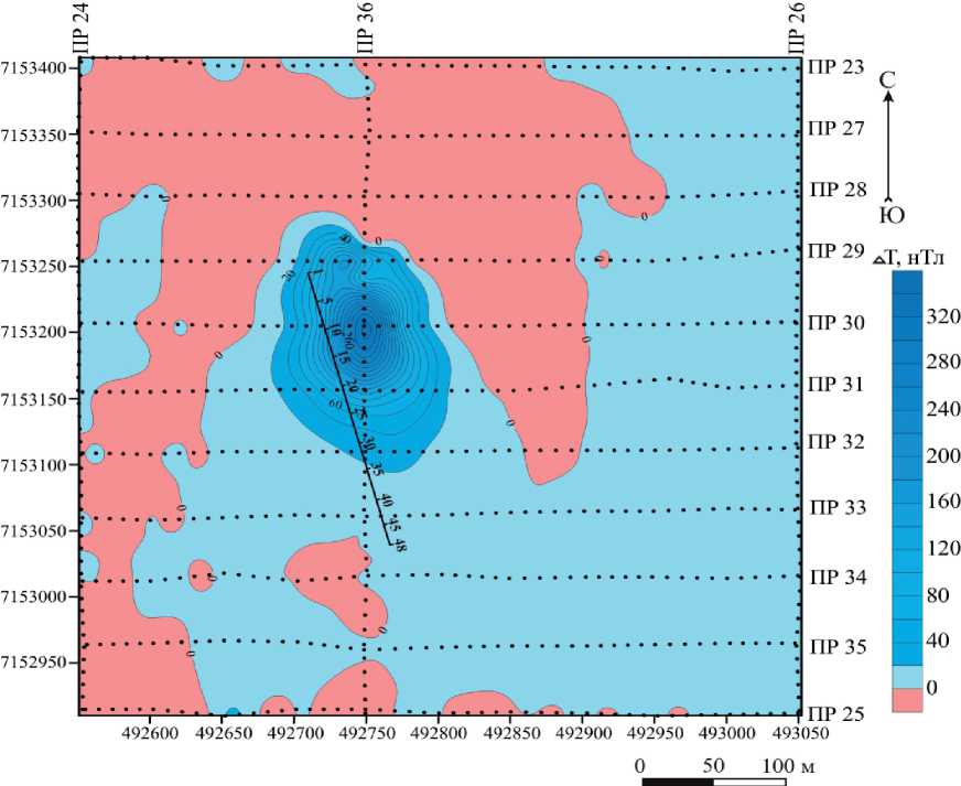 Рис. 4. Карта изолиний аномального магнитного поля Павьюгской аномалии масштаба 1:1000.