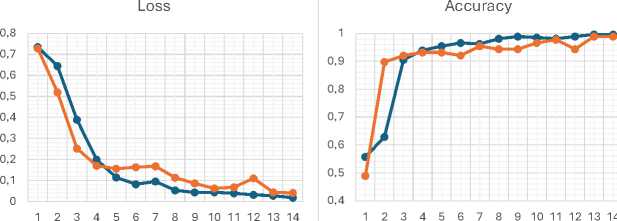 Классификатор тренировался на трех разных выборках, полученных из образцов (a), (b) и на всех изображениях, за исключением образца (c). Использовалась ИНС прямого распространения с пятью полносвязными слоями: начальный слой принимает 512-мерные векторы ResNet18, с последующими нелинейными преобразованиями через слои с активациями softmax, relu и sigmoid. Выходной слой имеет одну нейронную единицу с активацией sigmoid, интерпретируемую как вероятность принадлежности объекта положительному классу. Сеть обучена с использованием функции потерь binary-crossentropy и оптимизатора Adam. Общее количество тренируемых параметров: 618660. Кривые точности и функции потерь на обучающей и валидационной выборке представлены на рисунке 4.