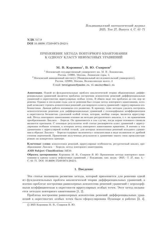 Одной из фундаментальных проблем аналитической теории обыкновенных дифференциальных уравнений является проблема построения асимптотик решений дифференциальных уравнений в окрестностях иррегулярных особых точек. В общем виде эта проблема до сих пор не решена. Однако в последние годы для ее решения был создан метод повторного квантования, который позволяет строить асимптотики решений для широкого класса уравнений с иррегулярными особенностями. Данная работа посвящена его развитию. К примеру, этим методом удалось построить асимптотические решения для дифференциальных уравнений с голоморфными коэффициентами в окрестности бесконечно удаленной особой точки, которая, вообще говоря, является иррегулярной. Метод повторного квантования основан на методах ресургентного анализа, т. е. на применении преобразования Лапласа - Бореля. Он применяется в том случае, когда корни основного символа являются кратными. С помощью результатов этой статьи расширяется класс уравнений с иррегулярными особыми точками, к которым метод повторного квантования применим. А именно к тем уравнениям с иррегулярной особой точкой, для которых асимптотики решений исходного уравнения в образах Лапласа - Бореля содержат экспоненты с показателями в виде полиномов от дробной степени переменной. Применение полученных результатов к уравнению такого типа проиллюстрировано на конкретном примере.