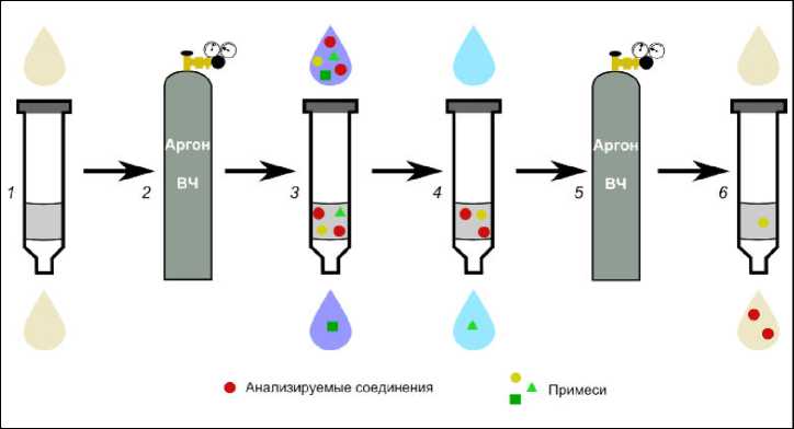 1 – кондиционирование сорбента растворителями; 2 – сушка сорбента в потоке аргона и подготовка для внесения пробы; 3 – фильтрация анализируемой воды; 4 – промывка сорбента и удаление мешающих компонентов (солей); 5 – сушка сорбента в потоке аргона и подготовка для элюирования; 6 – элюирование растворителем целевых компонентов