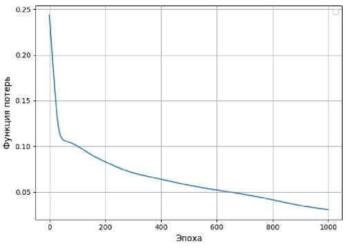 На рисунке 4 приведён график изменения функции потерь (на обучающей выборке) при обучении нейронной сети с 30 нейронами в скрытом слое. Полученные в процессе обучения результаты (значения функции потерь) свидетельствуют о приемлемом качестве построенной нейросетевой модели и потенциальной возможности её применения к рассматриваемой задаче. Для создания и обучения НС, визуализации данных использовались язык программирования Python , библиотека машинного и глубокого обучения PyTorch 6, библиотека для обработки и анализа данных Pandas 7 , библиотека для визуализации данных Matplotlib 8.