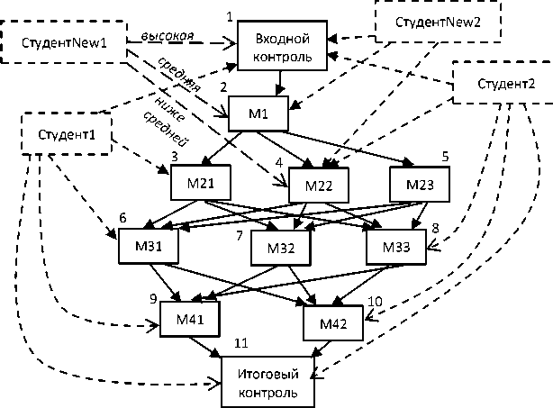 Представленный граф ЭУК содержит также вершины, соответствующие изучающим курс студентам. Наличие связи между вершиной, соответствующей студенту, и вершиной, соответствующей учебному модулю или промежуточному и/или итоговому контролю, свидетельствует о том, что студент изучил этот модуль или прошёл точки контроля ЭУК. Связи между вершинами в этом случае (студент и входной и итоговый контроль, студент и учебные модули) могут иметь четыре типа: НижеСреднего, Средний, ВышеСреднего, Высокий. Конкретный тип связи соответствует результатам освоения соответствующего модуля и результатам прохождения входного и/или итогового контроля. Набор тестов для промежуточного контроля по каждому разделу в данном курсе одинаков для всех альтернативных учебных модулей раздела. Предполагается, что в случае неудовлетворительного результата студент изучает модуль курса повторно. В общем случае в подобной ситуации разработчик курса может предусмотреть альтернативные учебные модули для изучения студентом.