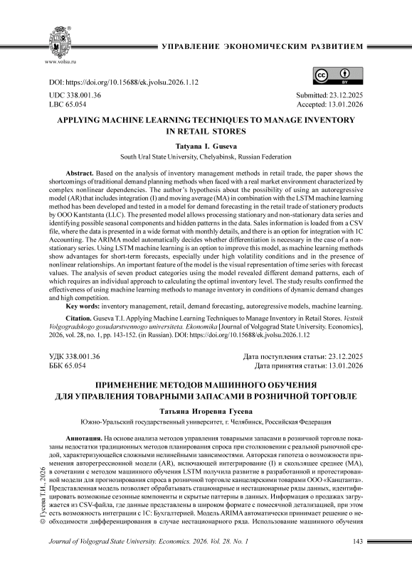 Based on the analysis of inventory management methods in retail trade, the paper shows the shortcomings of traditional demand planning methods when faced with a real market environment characterized by complex nonlinear dependencies. The author’s hypothesis about the possibility of using an autoregressive model (AR)that includes integration (I) and moving average (MA) in combination with the LSTM machine learning method has been developed and tested in a model for demand forecasting in the retail trade of stationery products by OOO Kantstanta (LLC). The presented model allows processing stationary and non-stationary data series and identifying possible seasonal components and hidden patterns in the data. Sales information is loaded from a CSV file, where the data is presented in a wide format with monthly details, and there is an option for integration with 1C Accounting. The ARIMA model automatically decides whether differentiation is necessary in the case of a nonstationary series. Using LSTM machine learning is an option to improve this model, as machine learning methods show advantages for short-term forecasts, especially under high volatility conditions and in the presence of nonlinear relationships. An important feature of the model is the visual representation of time series with forecast values. The analysis of seven product categories using the model revealed different demand patterns, each of which requires an individual approach to calculating the optimal inventory level. The study results confirmed the effectiveness of using machine learning methods to manage inventory in conditions of dynamic demand changes and high competition.