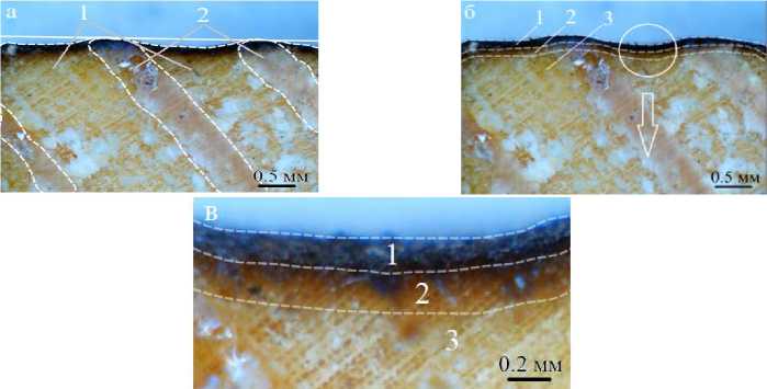 Также заметен цветовой градиент от черного на поверхности древесины до желтого на расстоянии 0.5 мм и ниже от поверхности. На рис. 3 б,в выделены три цветовые области, соответствующие разным стадиям разложения древесины. Область 1 толщиной ~0.2 мм имеет черный окрас и соответствует стадии разложения углерода. Область 2 толщиной ~ 0.25 мм имеет градиентный окрас от коричневого до золотистого цвета, соответствует стадии пиролиза древесины. Об- ласть 3 имеет светло-желтый окрас и соответствует исходной древесине (с началом процесса сушки на границе с областью 2).