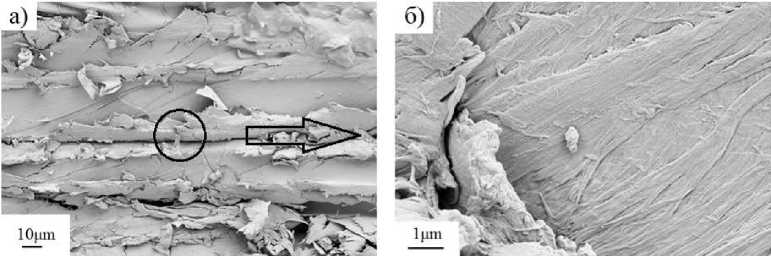 Рис. 2. М икро фото графии п ов ер хно с ти ср е за о б р аз цо в из со сны : а — исходный образец; б — об р а бо т а нны й по т о к о м низ кот емп ературной плазмы