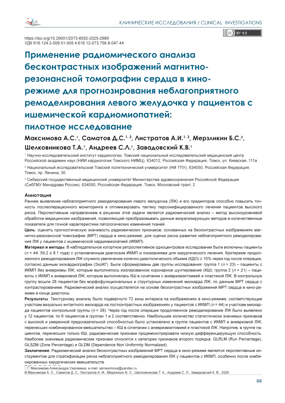 Раннее выявление неблагоприятного ремоделирования левого желудочка (ЛЖ) и его предикторов способно повысить точность послеоперационного мониторинга и оптимизировать тактику персонифицированного лечения пациентов высокого риска. Перспективным направлением в решении этой задачи является радиомический анализ – метод высокоуровневой обработки медицинских изображений, позволяющий преобразовывать данные визуализирующих методов в количественные показатели для точной характеристики патологических изменений тканей. Цель: оценить прогностическую значимость радиомических признаков, основанных на бесконтрастных изображениях магнитно-резонансной томографии (МРТ) сердца в кино-режиме, для оценки риска развития неблагоприятного ремоделирования ЛЖ у пациентов с ишемической кардиомиопатией (ИКМП). Материал и методы. В наблюдательное когортное ретроспективное одноцентровое исследование были включены пациенты (n = 44; 59,2 ± 8,1 года) с установленным диагнозом ИКМП и показаниями для хирургического лечения. Критерием продолженного ремоделирования ЛЖ служило увеличение конечно-диастолического объема (КДО) ≥ 10% через год после операции, согласно данным эхокардиографии (ЭхоКГ). Были сформированы две группы исследования: группа 1 (n = 23) – пациенты с ИКМП без аневризмы ЛЖ, которым выполнялось изолированное коронарное шунтирование (КШ); группа 2 (n = 21) – пациенты с ИКМП и аневризмой ЛЖ, которым выполнялась КШ в сочетании с аневризмэктомией и пластикой ЛЖ. В контрольную группу вошли 28 пациентов без морфофункциональных и структурных изменений миокарда ЛЖ, по данным МРТ сердца с контрастированием. Радиомический анализ осуществлялся на основе бесконтрастных изображений МРТ сердца в кино-режиме в конце диастолы. Результаты. Текстурному анализу было подвергнуто 72 зоны интереса на изображениях в кино-режиме, соответствующие участкам визуально интактного миокарда на постконтрастных изображениях у пациентов с ИКМП (n = 44) и участкам миокарда пациентов контрольной группы (n = 28). Через год после операции продолженное ремоделирование ЛЖ было выявлено у 12 пациентов: по 6 пациентов в группах 1 и 2 соответственно. Наибольшее количество статистически значимых признаков с высокой и умеренной предсказательной способностью было установлено в группе пациентов с ИКМП и аневризмой ЛЖ, перенесших комбинированное вмешательство – КШ в сочетании с аневризмэктомией и пластикой ЛЖ. Напротив, в группе пациентов, перенесших только КШ, радиомические признаки продемонстрировали низкую дифференцирующую способность. Наиболее значимые радиомические признаки относятся к категории признаков второго порядка: GLRLM (Run Percentage), GLSZM (Zone Percentage) и GLDM (Dependence Non Uniformity Normalized). Заключение. Радиомический анализ бесконтрастных изображений МРТ сердца в кино-режиме является перспективным инструментом для стратификации риска неблагоприятного ремоделирования ЛЖ у пациентов с ИКМП, особенно после комбинированных хирургических вмешательств.