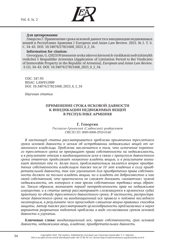 Текст статьи ПРИМЕНЕНИЕ СРОКА ИСКОВОЙ ДАВНОСТИ К ВИНДИКАЦИИ НЕДВИЖИМЫХ ВЕЩЕЙ В РЕСПУБЛИКЕ АРМЕНИЯ