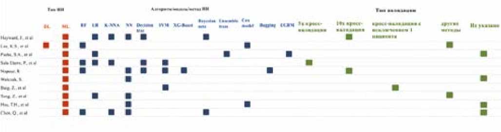 Во всех 10 исследованиях (100%) использовали алгоритмы машинного обучения, в одной работе также применялся алгоритм глубокого обучения (10%). В исследованиях применялись различные алгоритмы ИИ, нейронные сети использовались в 60% работ, случайный лес — 40%, а древо решений — в 30% случаев. Подробная информация касательного характеристик применяемых алгоритмов представлена в таблице 1.