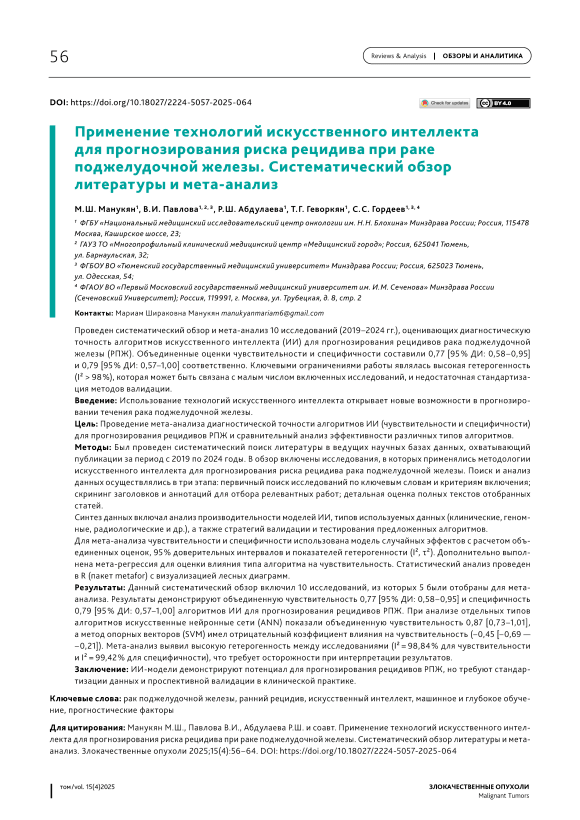 Проведен систематический обзор и мета анализ 10 исследований (2019–2024 гг.), оценивающих диагностическую точность алгоритмов искусственного интеллекта (ИИ) для прогнозирования рецидивов рака поджелудочной железы (РПЖ). Объединенные оценки чувствительности и специфичности составили 0,77 [95 % ДИ: 0,58–0,95] и 0,79 [95 % ДИ: 0,57–1,00] соответственно. Ключевыми ограничениями работы являлась высокая гетерогенность (I² > 98 %), которая может быть связана с малым числом включенных исследований, и недостаточная стандартизация методов валидации. Введение: Использование технологий искусственного интеллекта открывает новые возможности в прогнозировании течения рака поджелудочной железы. Цель: Проведение мета анализа диагностической точности алгоритмов ИИ (чувствительности и специфичности) для прогнозирования рецидивов РПЖ и сравнительный анализ эффективности различных типов алгоритмов. Методы: Был проведен систематический поиск литературы в ведущих научных базах данных, охватывающий публикации за период с 2019 по 2024 годы. В обзор включены исследования, в которых применялись методологии искусственного интеллекта для прогнозирования риска рецидива рака поджелудочной железы. Поиск и анализ данных осуществлялись в три этапа: первичный поиск исследований по ключевым словам и критериям включения; скрининг заголовков и аннотаций для отбора релевантных работ; детальная оценка полных текстов отобранных статей. Синтез данных включал анализ производительности моделей ИИ, типов используемых данных (клинические, геномные, радиологические и др.), а также стратегий валидации и тестирования предложенных алгоритмов. Для мета анализа чувствительности и специфичности использована модель случайных эффектов с расчетом объединенных оценок, 95 % доверительных интервалов и показателей гетерогенности (I², τ²). Дополнительно выполнена мета регрессия для оценки влияния типа алгоритма на чувствительность. Статистический анализ проведен в R (пакет metafor) с визуализацией лесных диаграмм. Результаты: Данный систематический обзор включил 10 исследований, из которых 5 были отобраны для метаанализа. Результаты демонстрируют объединенную чувствительность 0,77 [95 % ДИ: 0,58–0,95] и специфичность 0,79 [95 % ДИ: 0,57–1,00] алгоритмов ИИ для прогнозирования рецидивов РПЖ. При анализе отдельных типов алгоритмов искусственные нейронные сети (ANN) показали объединенную чувствительность 0,87 [0,73–1,01], а метод опорных векторов (SVM) имел отрицательный коэффициент влияния на чувствительность (–0,45 [–0,69 — −0,21]). Мета анализ выявил высокую гетерогенность между исследованиями (I² = 98,84 % для чувствительности и I² = 99,42 % для специфичности), что требует осторожности при интерпретации результатов. Заключение: ИИ модели демонстрируют потенциал для прогнозирования рецидивов РПЖ, но требуют стандартизации данных и проспективной валидации в клинической практике.