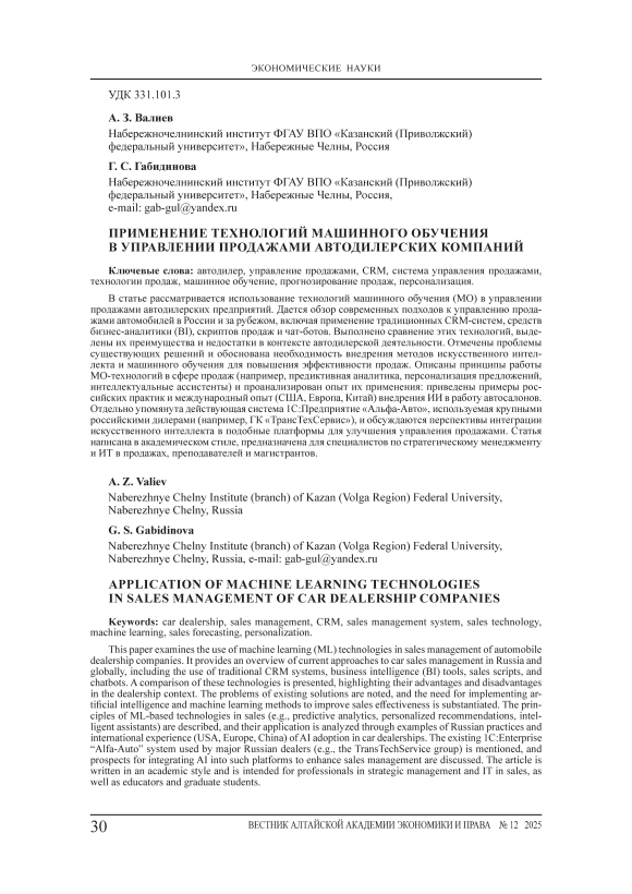 В статье рассматривается использование технологий машинного обучения (МО) в управлении продажами автодилерских предприятий. Дается обзор современных подходов к управлению продажами автомобилей в России и за рубежом, включая применение традиционных CRM-систем, средств бизнес-аналитики (BI), скриптов продаж и чат-ботов. Выполнено сравнение этих технологий, выделены их преимущества и недостатки в контексте автодилерской деятельности. Отмечены проблемы существующих решений и обоснована необходимость внедрения методов искусственного интеллекта и машинного обучения для повышения эффективности продаж. Описаны принципы работы МО-технологий в сфере продаж (например, предиктивная аналитика, персонализация предложений, интеллектуальные ассистенты) и проанализирован опыт их применения: приведены примеры российских практик и международный опыт (США, Европа, Китай) внедрения ИИ в работу автосалонов. Отдельно упомянута действующая система 1С:Предприятие «Альфа-Авто», используемая крупными российскими дилерами (например, ГК «ТрансТехСервис»), и обсуждаются перспективы интеграции искусственного интеллекта в подобные платформы для улучшения управления продажами. Статья написана в академическом стиле, предназначена для специалистов по стратегическому менеджменту и ИТ в продажах, преподавателей и магистрантов.
