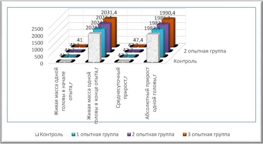 В начале выращивания живая масса одной головы бройлера имела диапазон 41,0 г – 41,3 г. На заключительном этапе эксперимента в 42 дневном возрасте живая масса птицы всех опытных групп не имела значительных различий. На заключительном этапе наших исследований наибольшая живая масса (2031,4 г) зафиксирована у бройлеров третьей опытной группы, рацион которой был скорректирован путем добавления соломы пшеницы, обработанной грибами Fusarium oxysporum. Этот показатель имел более низкие значения у птицы контрольной, первой опытной и второй опытной групп. У цыплят-бройлеров контрольной группы он был ниже на 1,97%, в первой опытной группе на 1,38%, и во второй опытной группе на 3,7%. Однако достоверных различий по этому показателю нами не зафиксировано. За весь период выращивания среднесуточный прирост составил в первой опытной группе - 47,2 г, в третьей опытной группе - 47,4 г, в первой опытной и контрольной группах по 47,3 г.