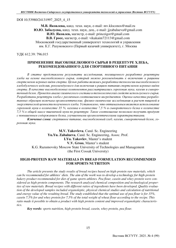 В статье представлены результаты исследования, посвященного разработке рецептуры хлеба на основе высокобелкового сырья, который можно рекомендовать к включению в рационы спортсменов игровых видов спорта. Целью работы являлась разработка технологии высокобелкового хлебобулочного изделия, рекомендуемого для включения в рацион питания спортсменов игровых видов спорта. В качестве высокобелковых компонентов рассматривались гороховая мука, казеин и сывороточный белок. Проведен анализ химического состава и технологических свойств используемого сырья. Разработаны рецептуры хлеба с различным соотношением ингредиентов. Оценка качества разработанных образцов включала органолептические, физико-химические исследования и расчет пищевой и энергетической ценности полученного хлеба. Установлено, что оптимальным является использование гороховой муки в количестве 35 %, казеина в количестве 7,5 % и сывороточного белка в количестве 7,5 % к общей массе пшеничной муки по рецептуре. Такое соотношение позволило получить продукт с повышенным содержанием белка, улучшенными органолептическими характеристиками.