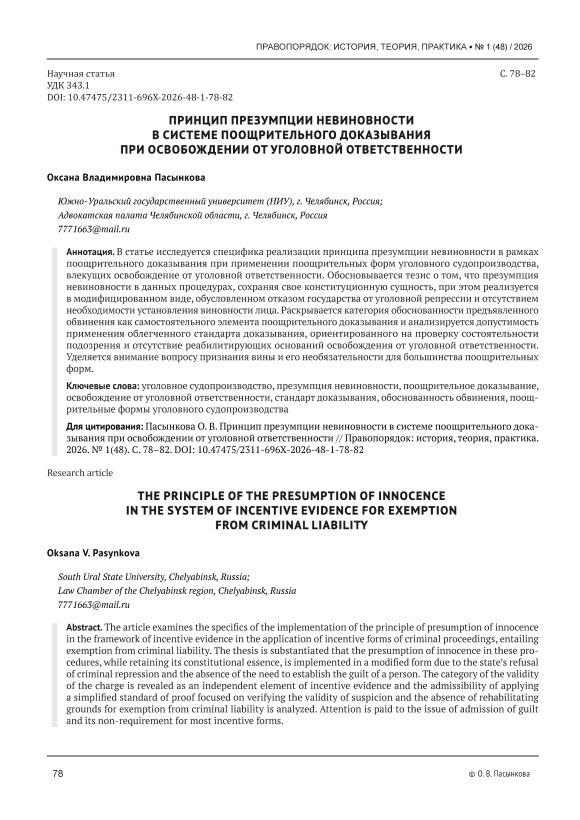 В статье исследуется специфика реализации принципа презумпции невиновности в рамках поощрительного доказывания при применении поощрительных форм уголовного судопроизводства, влекущих освобождение от уголовной ответственности. Обосновывается тезис о том, что презумпция невиновности в данных процедурах, сохраняя свое конституционную сущность, при этом реализуется в модифицированном виде, обусловленном отказом государства от уголовной репрессии и отсутствием необходимости установления виновности лица. Раскрывается категория обоснованности предъявленного обвинения как самостоятельного элемента поощрительного доказывания и анализируется допустимость применения облегченного стандарта доказывания, ориентированного на проверку состоятельности подозрения и отсутствие реабилитирующих оснований освобождения от уголовной ответственности. Уделяется внимание вопросу признания вины и его необязательности для большинства поощрительных форм.