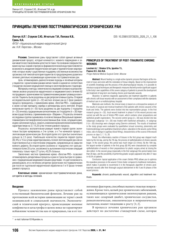 Заживление раны представляет собой единый активный динамический процесс, который начинается с момента повреждения и заканчивается восстановлением целостности ткани. На основании совершенствования научных знаний и прогресса фармакологической индустрии появляется возможность внедрения хирургических методик и терапевтических мероприятий, которые окажут существенную поддержку собственным возможностям организма этой тяжелой категории пациентов по предупреждению развития и лечения длительно незаживающих хронических посттравматических ран. Цель: оптимизировать диагностические подходы и лечебный алгоритм у пациентов с хроническими ранами мягких тканей и оценкой их соответствия стандартам оказания медицинской помощи в многопрофильном стационаре. Материалы и методы: клиническое исследование основано на ретроспективном анализе результатов хирургического и медикаментозного лечения 82 пострадавших с хроническими посттравматическими ранами туловища и конечностей. Пациенты были разделены на две репрезентативные группы. В первой исследовательской группе (n = 32) местное лечение ран во II фазе раневого процесса проводилось с применением крема «Велстик-PRO», содержащего в своем составе препараты серебра и регенераторы роста эпителия. Вторая контрольная группа (n = 50) была разделена на две подгруппы (I подгруппа (n = 20) лечилась традиционными антисептиками, во II подгруппе (n = 30) перевязки осуществлялись с применением мази «Эбермин»). Результаты лечения в исследуемых группах оценивались по количественным (Визуальный скрининг, планеметрия и гистоморфология) и качественным (Бак. посев, сатурация в ране, индекс наполнения пульса, скорость изменения кровонаполнения капилляров) характеристикам на 3, 7, 15, 20 сутки течения раневого процесса. Результаты: воспалительная реакция тканей в первой группе значительно быстрее купировалась к 3-м суткам, а к 7-м начинался процесc с эпителизации хронических ран. Во второй группе этот срок был значительно дольше (в 2,5 раза). Наибольшее количество пациентов первой группы (82,4%) к 15-м суткам характеризовались полной эпителизацией ран или их подготовленностью к пластическим операциям, направленным на закрытие кожного дефекта. Во второй группе (особенно в I подгруппе) этот срок растягивался более 20 суток, а возможность выполнения пластических операций появлялась только через 27 суток у 43,5% больных. Заключение: местное применение крема «Велстик-PRO» позволяет оптимизировать репаративные процессы в ране в 2 раза быстрее по сравнению с традиционными медикаментозными средствами, что дает возможность рекомендовать его в лечебном алгоритме хронических посттравматических ран после их тщательной хирургической обработки во II и III фазах течения раневого процесса.