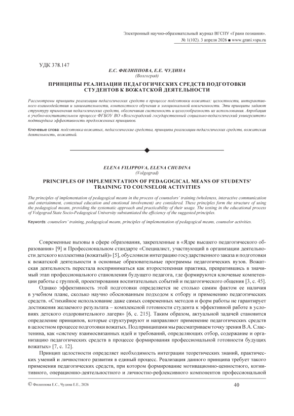 Рассмотрены принципы реализации педагогических средств в процессе подготовки вожатых: целостности, интерактивного взаимодействия и занимательности, контекстного обучения и эмоциональной вовлеченности. Эти принципы задают структуру применения педагогических средств, обеспечивая системность и целесообразность их использования. Апробация в учебно-воспитательном процессе ФГБОУ ВО «Волгоградский государственный социально-педагогический университет» подтвердила эффективность предложенных принципов.