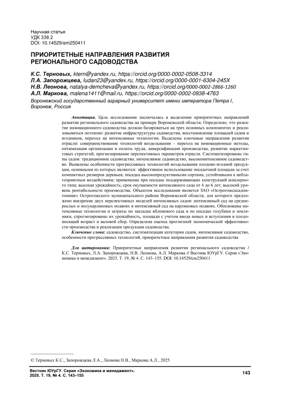 Цель исследования заключалась в выделении приоритетных направлений развития регионального садоводства на примере Воронежской области. Определено, что развитие инновационного садоводства должно базироваться на трех основных компонентах и реализовываться поэтапно: развитие инфраструктуры садоводства, восстановление площадей садов и ягодников, переход на интенсивные технологии. Выделены ключевые направления развития отрасли: совершенствование технологий возделывания – переход на инновационные методы, оптимизация организации и оплаты труда, диверсификация производства, развитие маркетинговых стратегий, прогнозирование перспективных параметров отрасли. Систематизированы типы садов: традиционное садоводство, интенсивное садоводство, высокоинтенсивное садоводство. Выявлены особенности прогрессивных технологий возделывания плодово-ягодной продукции, основными из которых являются: эффективное использование посадочной площади за счет компактных размеров деревьев; посадка высокопродуктивными сортами, устойчивыми к неблагоприятным воздействиям; применение при посадке поддерживающих конструкций шпалерного типа; высокая урожайность; срок окупаемости интенсивного сада от 4 до 6 лет; высокий уровень рентабельности производства. Объектом исследования является ЗАО «Острогожсксадпитомник» Острогожского муниципального района Воронежской области, для которого предложено внедрение двух перспективных моделей интенсивных садов: интенсивный сад на среднерослых и полукарликовых подвоях и интенсивный сад на карликовых подвоях. Обоснованы интенсивные технологии и затраты по закладке яблоневого сада и по посадке голубики и земля-ники, спрогнозированы их урожайность, площади с учетом ввода новых и вступления в плодоносящий возраст и валовой сбор. Определена оценка прогнозной экономической эффективности производства и реализации продукции садоводства.