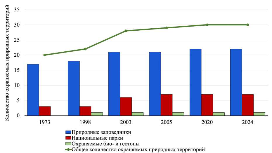 Рисунок 2. Количество охраняемых природных территорий на Шпицбергене с 1973 года по настоящее время
