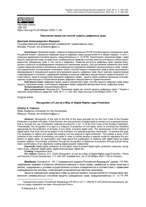 Текст научной статьи Признание права как способ защиты цифровых прав