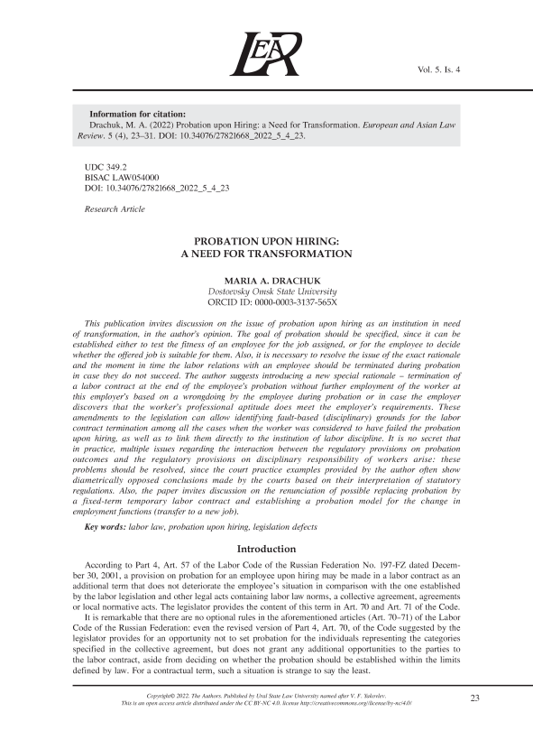 Drachuk, M. A. & Kuchina, Yu. A. (2020) Spornye voprosy konstruktsii srochnogo trudovogo dogovora kak formy vzaimnogo ogranicheniya prav rabotnika i rabotodatelya [Ñontroversial issues of the construction of a fixed-term employment contract as a form of mutual restriction of the rights of the employee and the employer]. Ezhegodnik trudovogo prava, 10, 67–79. (in Russian)