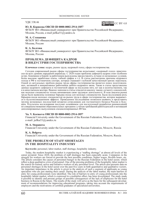 Сегодня современный рынок сферы гостеприимства испытывает «кадровый голод» практически на всех уровнях карьерной пирамиды. С 2020 годам проблема дефицита кадров стоит особенно остро. Компании в борьбе за работников вынуждены предоставлять лучшие из возможных условия, более высокие заработные платы, гибкий график и т.д. В статье рассмотрены причины кадрового голода в РФ в гостиничном секторе, которые отражают глубокий качественный кризис персонала. Одной из актуальных проблем рынка труда сферы гостеприимства является поиск подготовленных, активный и инициативных работников любого кадрового звена. Также в статье представлены данные кадрового дефицита в гостиничной сфере за последние пять лет как в количественном, так и в качественном векторе. Важное значение в статье отводится анализу такому сегменту соискателей, как молодые специалисты только начинающие свою трудовую деятельность. В ходе анализа рынка труда были выявлены основные барьеры входа для молодых специалистов. Была исследована роль барьеров входа молодых специалистов на рынок труда в сфере гостеприимства, которое выражается в мультипликационном эффекте. Проведенное исследование позволило выявить и представить группы возможных последствий нехватки сотрудников для гостиничного бизнеса России в будущем. Результаты исследования послужат основанием для последующей разработки рекомендаций по совершенствованию образовательных программ с учётом требований работодателей и мотиваций дипломированных выпускников специализированных ВУЗов.