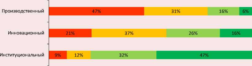 Инновационный ген практически соразмерно присутствует во всех квартильных группах по качеству жизни (см. рис. 2). В анализируемой выборке регионов доля регионов с сильным инновационным геном максимальна во второй квартильной группе по качеству жизни (37%) – Республика Мордовия, Вологодская, Тверская область и др. Качество жизни в данной группе выше, чем в производственной группе, но из-за невысокого качества институтов оно отстает от регионов-лидеров.