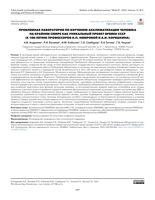 Проблемная лаборатория по изучению акклиматизации человека на Крайнем Севере как уникальный проект времен СССР (к 100-летию профессоров Н.П. Неверовой и А.И. Корешкина)