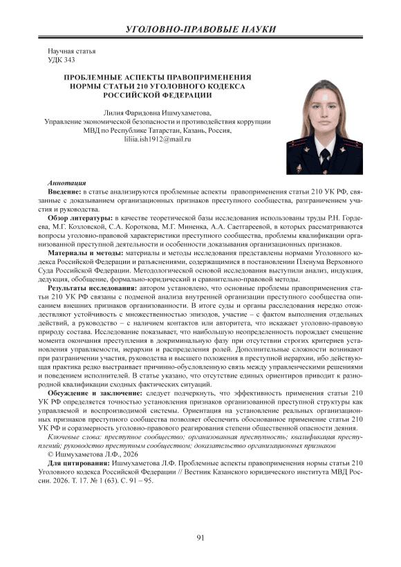 Обсуждение и заключение: следует подчеркнуть, что эффективность применения статьи 210 УК РФ определяется точностью установления признаков организованной преступной структуры как управляемой и воспроизводимой системы. Ориентация на установление реальных организационных признаков преступного сообщества позволяет обеспечить обоснованное применение статьи 210 УК РФ и соразмерность уголовно-правового реагирования степени общественной опасности деяния.