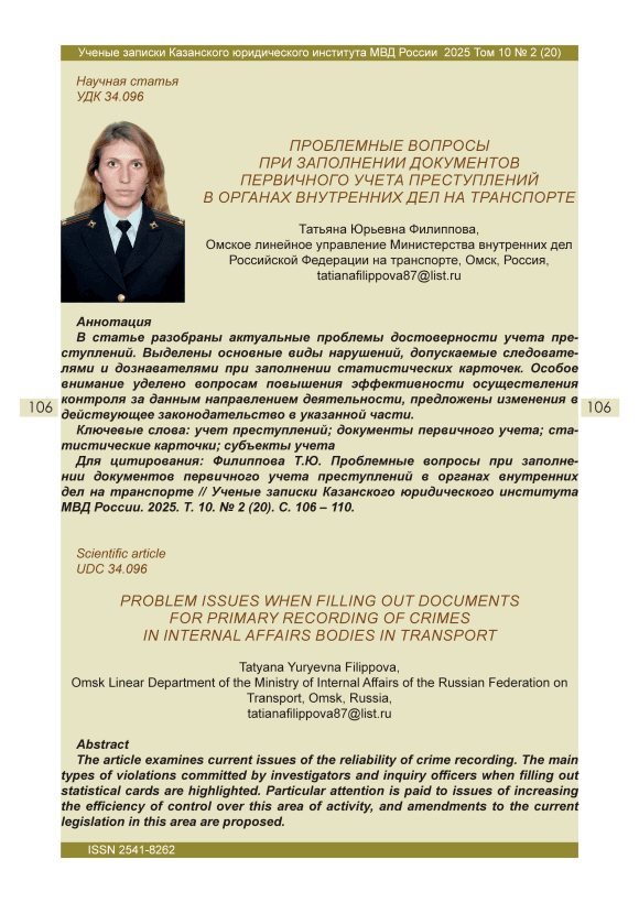 Текст научной статьи Проблемные вопросы при заполнении документов первичного учета преступлений в органах внутренних дел на транспорте