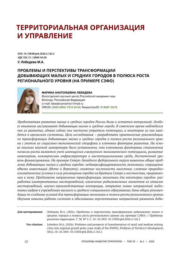 Проблематика развития малых и средних городов России была и остается актуальной. Особого внимания заслуживают добывающие малые и средние города. В советское время наблюдался пик их развития, однако сейчас они частично утратили потенциал, а некоторые из них находятся в кризисном состоянии. Цель исследования – разработать практические рекомендации по трансформации добывающих малых и средних городов в полюса роста регионального уровня с учетом их социально-экономической специфики и ключевых факторов развития. На основе анализа научной литературы было установлено, что ключевыми факторами становления полюсов роста являются учет имеющегося совокупного экономического потенциала, развитые инженерная, коммерческая инфраструктура и институциональная среда, достаточный уровень финансирования. На примере Северо-Западного федерального округа выявлены общие проблемы добывающих малых и средних городов: недиверсифицированность экономики; сокращение объема инвестиций (Инта и Воркута); снижение численности населения; сложные природно-климатические условия в силу размещения городов на Крайнем Севере и местностях, приравненных к нему. Предложены направления трансформации экономики для некоторых городов: разработка альтернативных месторождений, извлечение редкоземельных элементов из отвалов месторождений, научно-производственная кооперация, открытие новых направлений подготовки кадров в учреждениях высшего и среднего специального образования; даны общие рекомендации по созданию условий для трансформации экономики в полюса роста регионального уровня. Научная новизна работы состоит в обосновании перспективных направлений развития добывающих малых и средних городов на основе коммерциализации имеющихся у них сильных сторон. Материалы статьи могут быть полезны органам местного самоуправления добывающих малых и средних городов и органам государственной власти регионального уровня для разработки политики развития городов подобного типа и прилегающих к ним территорий