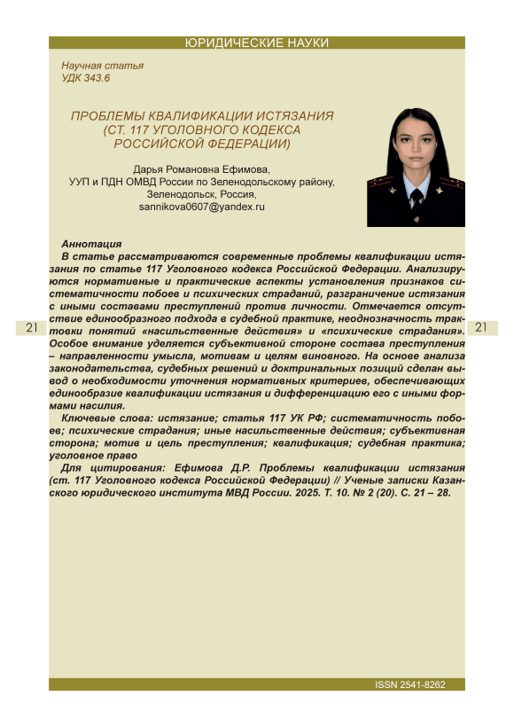 В статье рассматриваются современные проблемы квалификации истязания по статье 117 Уголовного кодекса Российской Федерации. Анализируются нормативные и практические аспекты установления признаков систематичности побоев и психических страданий, разграничение истязания с иными составами преступлений против личности. Отмечается отсутствие единообразного подхода в судебной практике, неоднозначность трактовки понятий «насильственные действия» и «психические страдания». Особое внимание уделяется субъективной стороне состава преступления – направленности умысла, мотивам и целям виновного. На основе анализа законодательства, судебных решений и доктринальных позиций сделан вывод о необходимости уточнения нормативных критериев, обеспечивающих единообразие квалификации истязания и дифференциацию его с иными формами насилия.
