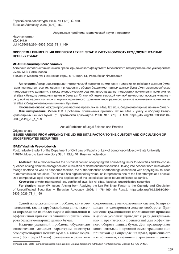 The author examines the historical context of applying this connecting factor to securities and the consequences arising from the emergence and circulation of dematerialized securities. Taking into account both Russian and foreign doctrine as well as economic realities, the author identifies shortcomings associated with applying lex rei sitae to dematerialized securities. The article has high scholarly value, as it represents one of the first attempts at a specialized comparative legal analysis of the application of the lex rei sitae factor to uncertificated securities.